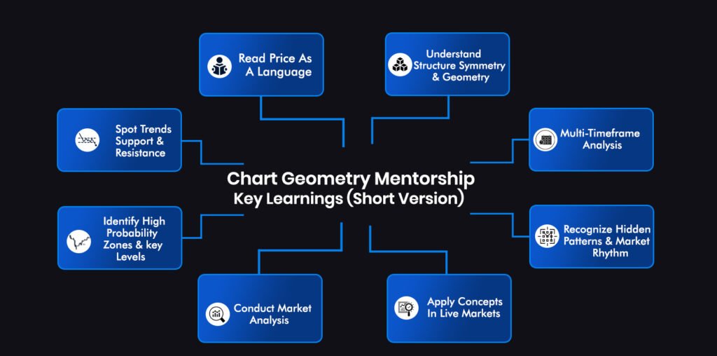 Chart Geometry is a price-based approach that focuses on understanding the natural structure of the market through geometry. It does not rely on indicators, predictions, or shortcuts.